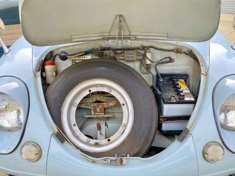 レストア直後ではないため、塗装割れや浮きサビなどあります。 でもタッチアップ塗装されてますので目立って恥ずかしいということはないでしょう。 タイヤは今や貴重なエコピア。スバル360の雰囲気にピッタリです。 オーバートップエンブレムが着きますが、飾りです。3速車です(笑)。 |