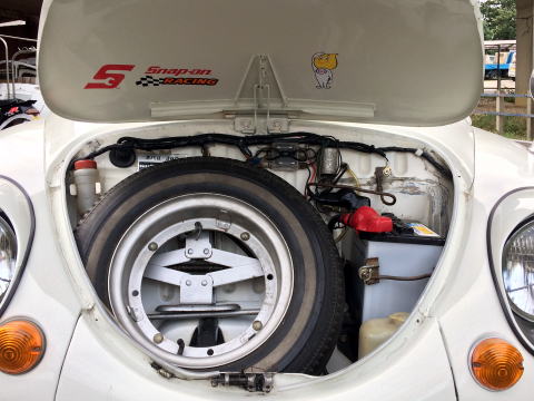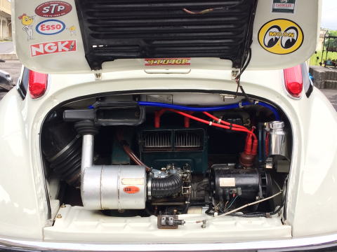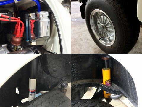 ぴかぴかに磨きこまれた当店謹製オイルタンク、ショックアブソーバはリアはVALTAIN KYB、フロントはSPAXレーシーな仕様です。 アルミリムはノーマルホイール&ホイールキャップ仕様に変更することも可能です。 また、オリジナルがご希望ならば屋根も塗り戻すこともできますよ。 |