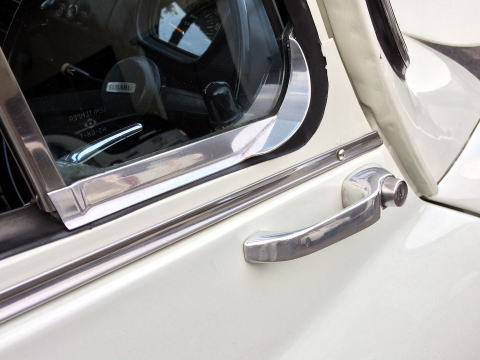 可愛がられていたおクルマです。アルミ部品は鏡のように磨きこまれています。 窓枠とドアノブに映り込んだスバルが判りますか? |