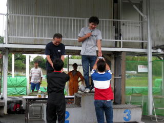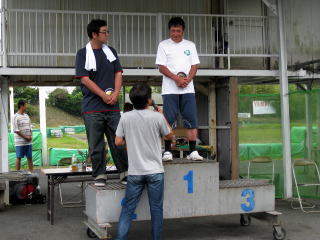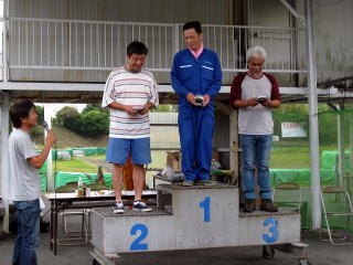 | S70−Vクラス (走行2台) 優勝 浅井選手 べレット 2位 浅野選手 VWタイプT 主催の浅井さん・・・ 優勝おめでとうございます。 表彰台の上でも仕切りますよ(笑) |