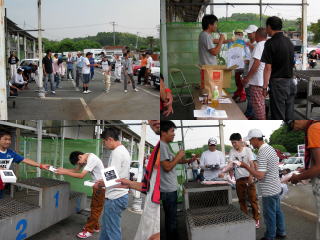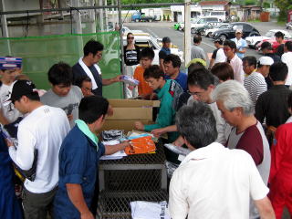 そして・・・・ 参加者全員に配られる記念品! 前回も好評だった「TTTオリジナル Tシャツ」と 「WAKO'Sボックスティッシュ」に群がる人々 今回はTシャツの色のバリエーションが 増えてましたね! |