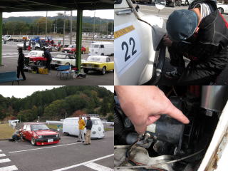 慣熟走行を終え、本番に向けマシンの調整! 右上写真は タイヤがフェンダーにあたる(>_<) 林嫁がぼやくと・・・ 力技でフェンダーを曲げるスバルの林 右下写真は 発電機のベルトを外し 林曰く・・・エネチャージらしいっす! |